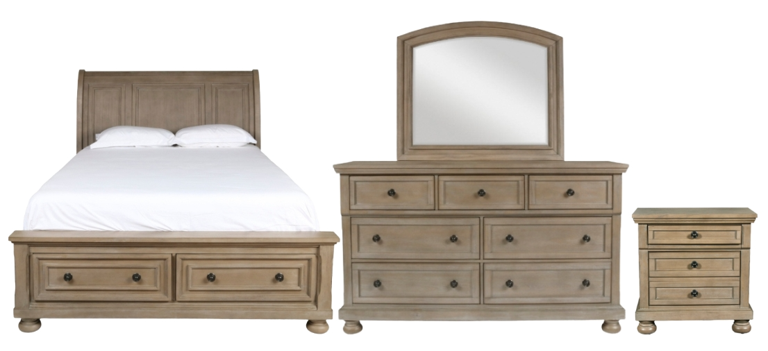 Set ncludes full sleigh bed, dresser, mirror and nightstand