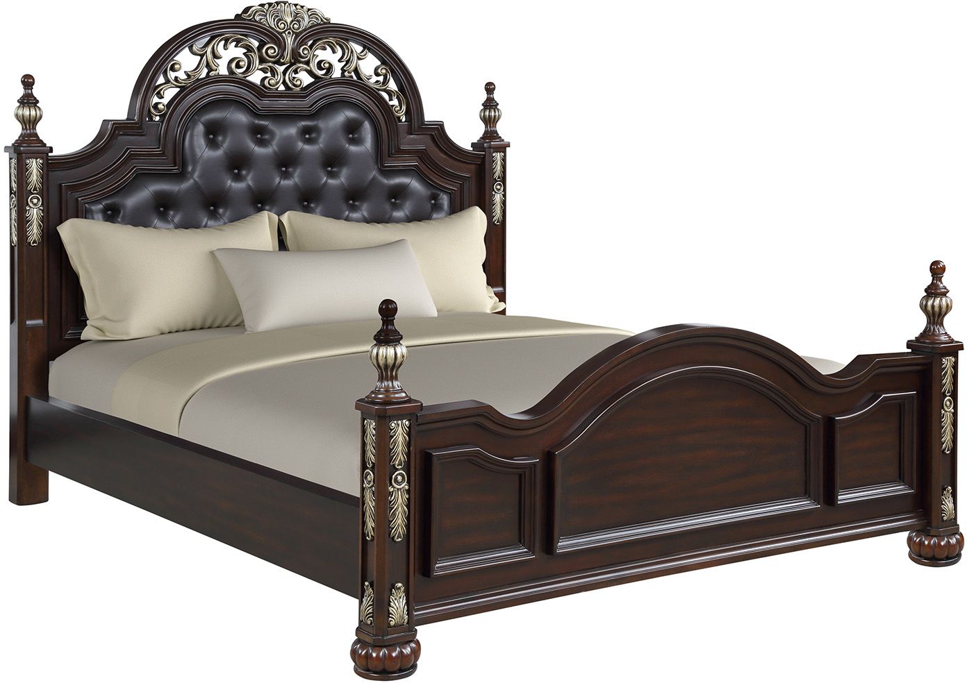 The Maximus Collection made with poplar solids and birch veneers. With its intricate craftsmanship and gracefully leaf design it will take your breath away. The fluted posting and turned claw foot details are accentuated by Madeira brown finish. The look is completed by elevated panels, matching hardware and distinctive moldings.