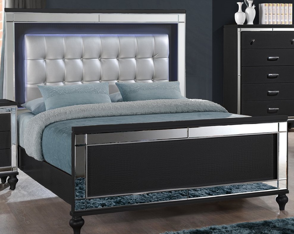 Featuring a lighted and upholstered headboard, the Valentino collection is brimming with features. Embossed inlays, mirrored borders, and turned feet all add to the unique styling of this suite.