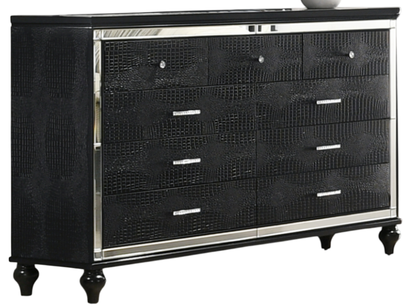 Discover the Valentino 9-drawer dresser in timeless black—a marvel of durable craftsmanship crafted from a blend of manufactured and solid woods, adorned with exquisite embossed inlays. Radiating with glitz and glam, its gleaming finish, mirrored trims, crystal-studded drawer pulls, and alligator-embossed accents capture the essence of Hollywood allure.Read More