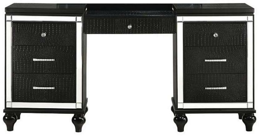 Featuring English dovetail MDF drawers, the Valentino Vanity Table is brimming with features. Embossed inlays, mirrored borders, and turned feet all add to the unique styling of this suite.Read More