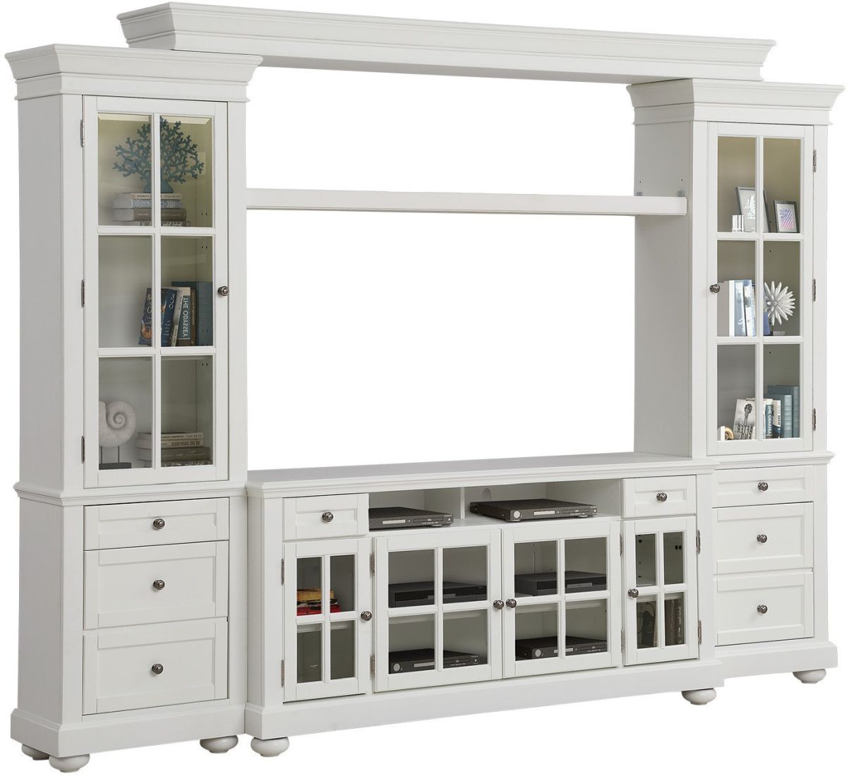 Brighten your nest with this beautiful four-piece Entertainment Wall from the Cape Cod collection. Perfect for displaying your television and electronics, this ensemble in a Vintage White finish creates a true focal point in the room while offering generous storage and display options.Read More
