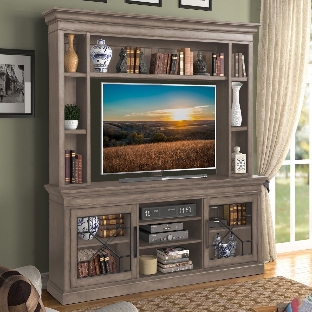 Its handsome hand-applied, multi-step Sandstone finish complements any room's décor while conveying unique character. Energy-efficient LED lighting with a three-way touch dimmer button highlights the treasures and collectibles you display. Two glass doors with decorative insets provide room for storage and display while three open center shelves are ideal for components. Inspired by the beauty of the great outdoors, it offers a distinctive look that's stunning from every angle.