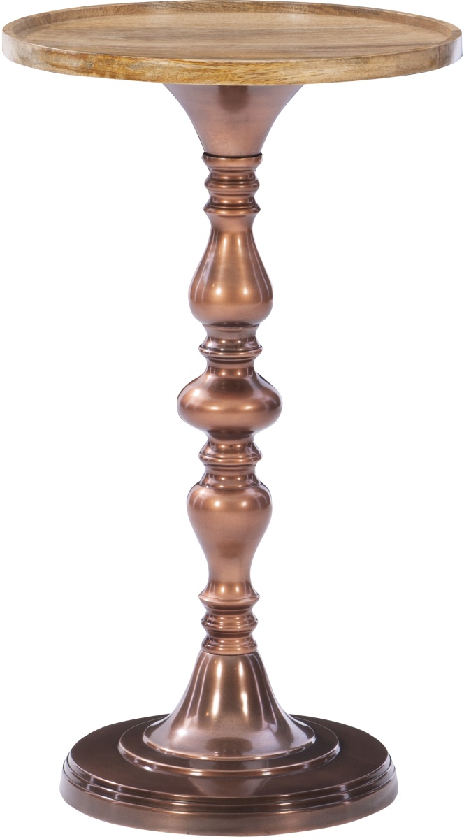 Mango wood top and copper plated aluminum pedestal complement many decor styles
