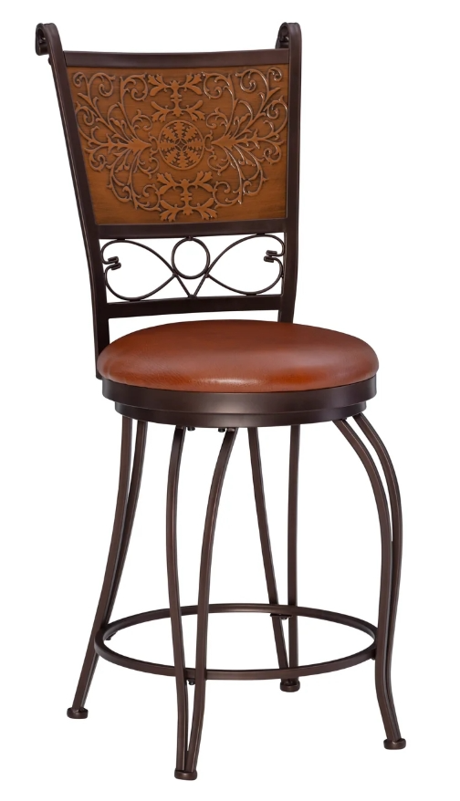 The details make the difference with this elegant counter stool. A stamped back enhances the look while curved front and angled back legs make the design even livelier. The cushioned faux leather seat is attractive and comfortable. The muted copper color stamp blends with the bronze finish.Read More
