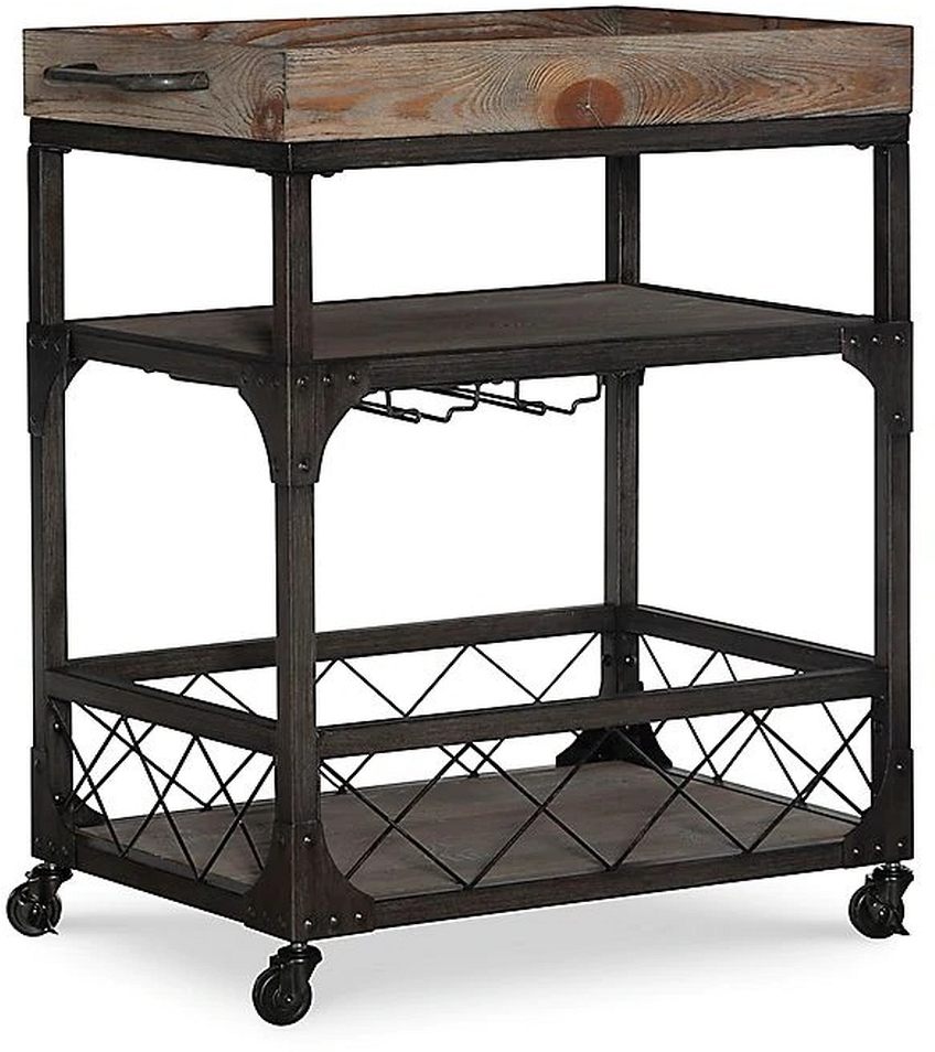 The cart boasts a wide tray-style top with two lover shelves, all in a weathered driftwood finish. Metal accents and framing ensure stability while offering a classic mixed materials look that works in the kitchen, dining room, or living area.