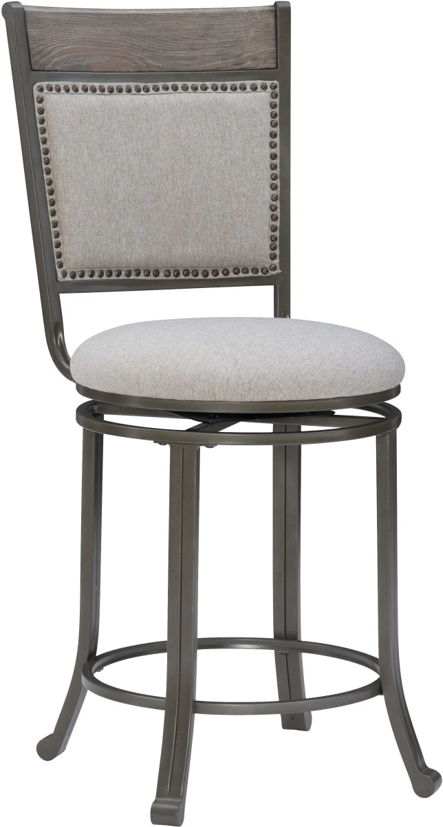 Mixing metal with wood, the transitional counter height stool provides a unique addition to your home. The stools feature a gray wash finished wood veneer combined with a beige fabric cushioned seat and back with nail head trim.Read More