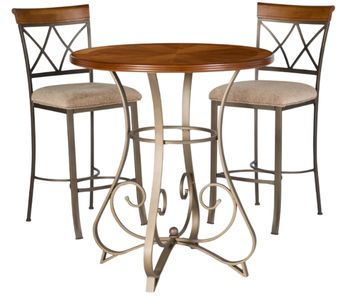 The 3-piece pub set is sure to add interest and ample table space. The round table features an interesting curve and scroll designed bottom. The bar stools feature a diamond shaped back and slight curved legs.Read More