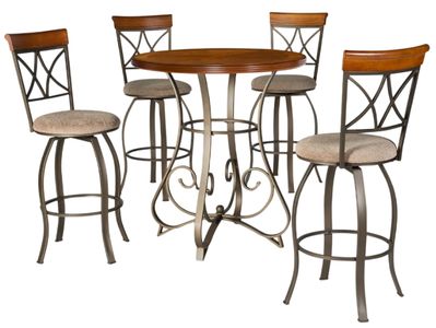 The 5-piece Faux Leatherb set is sure to add interest and ample table space. The Faux Leatherb table features an interesting curve and scroll designed bottom. The swivel bar stools feature a diamond shaped back and slight curved legs.Read More