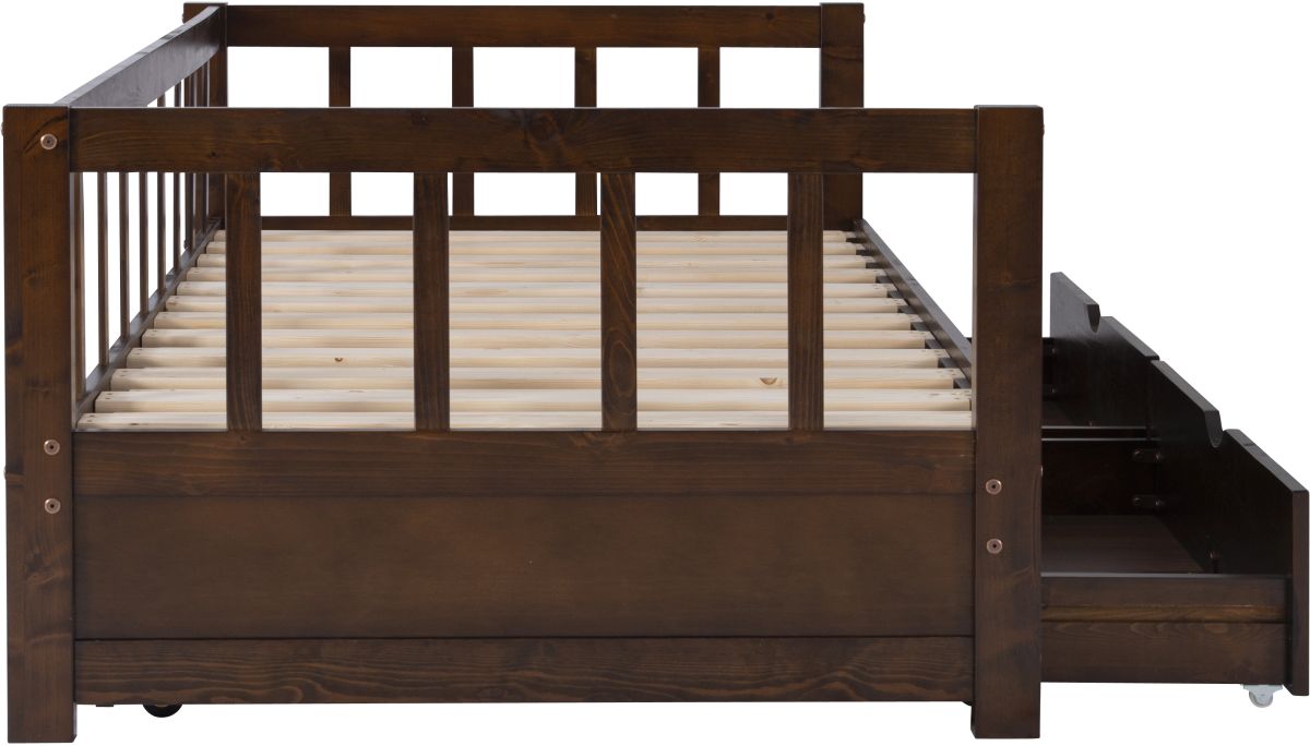 Providing ultimate flexibility for a guest room, kids room or small space living. This daybed converts easily from a twin size daybed to a full size king sleeping zone. Made of solid pine wood that is finished an espresso finish.Read More