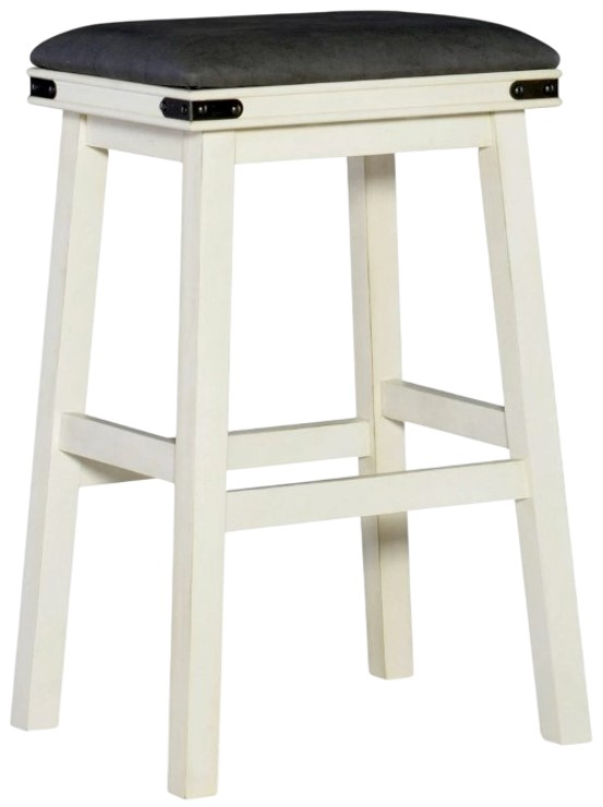 This backless Milligan bar stool features a crisp white wood finish and a plush gray butter‑soft seat cushion. Accented with subtle black hardware, it's designed for bar or counter seating, depending on height. Assembly is required. A sleek, versatile choice for casual dining or kitchen islands.Read More