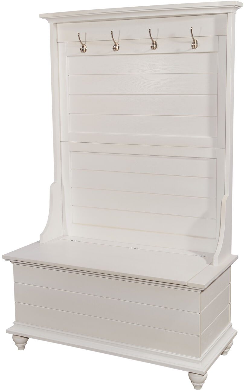 This Hall Tree, sets the mood in any foyer or mudroom. Perfect for storage and organization, the hall tree features a white finish over plank-style panels, with a hinged seat for interior storage and multiple hooks for coats and hats.