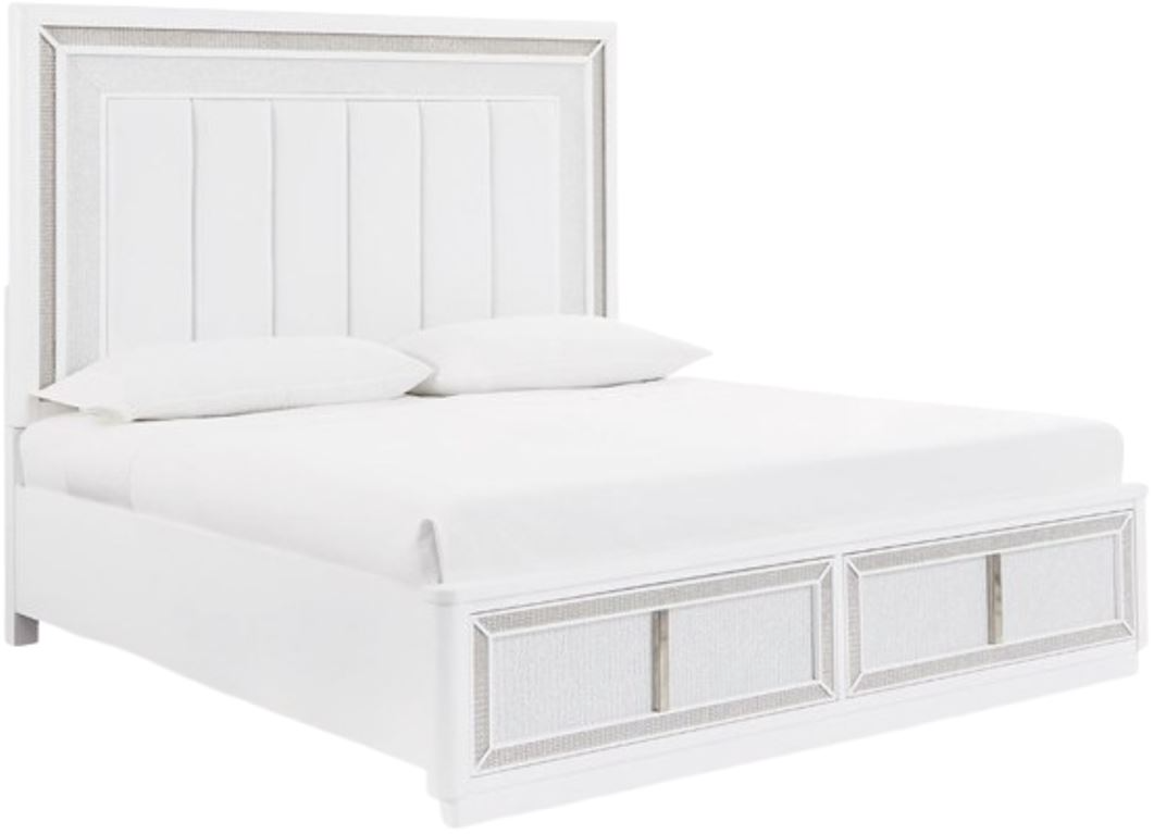 Includes king/California king upholstered headboard, storage footboard, rails and roll slats