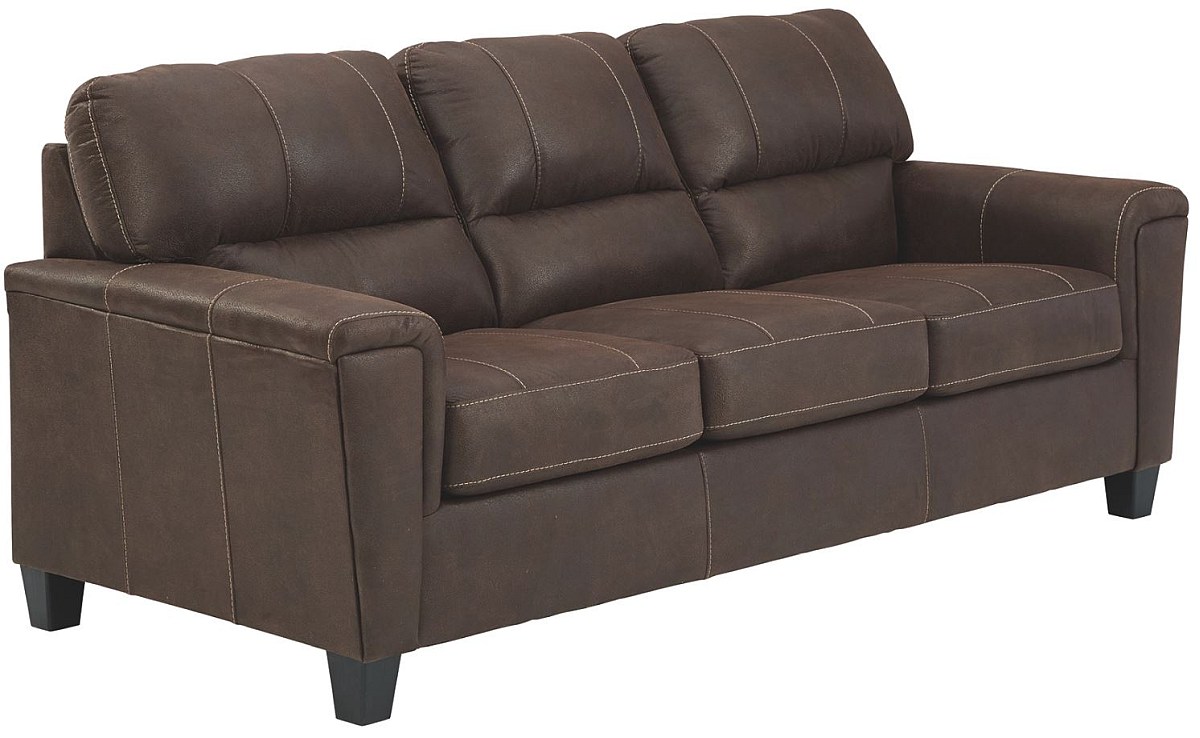 If you love the cool look of leather but long for the warm feel of fabric, you can take comfort in this sofa. Wrapped in a fabulous faux leather with a weathered hue and hint of pebbly texture to resemble the real deal, this decidedly modern sofa proves less is more. Elements include angled side profiling and track armrests wrapped with a layer of pillowy softness for that little something extra. Prominent jumbo stitching and clean-lined divided back styling lend fashion-forward flair..