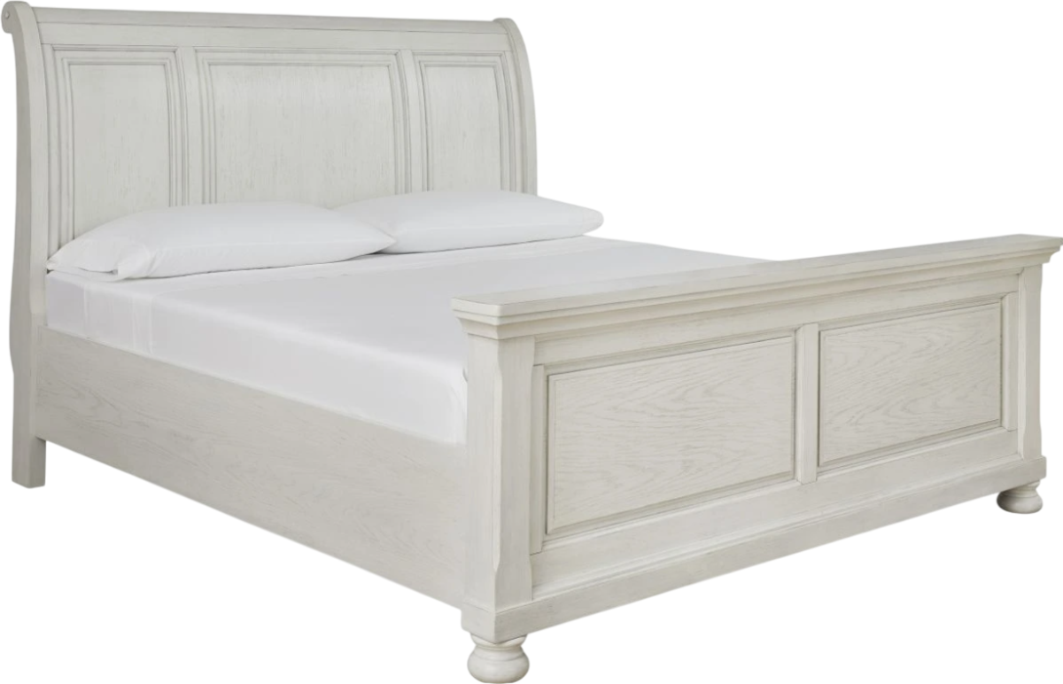 Elegant, timeless furnishings take your bedroom to the next level. Nothing does that better than this king sleigh bed. The antiqued white finish with a wonderful grain texture radiates sophistication, making this the perfect piece to round out the ultimate tasteful bedroom.Read More