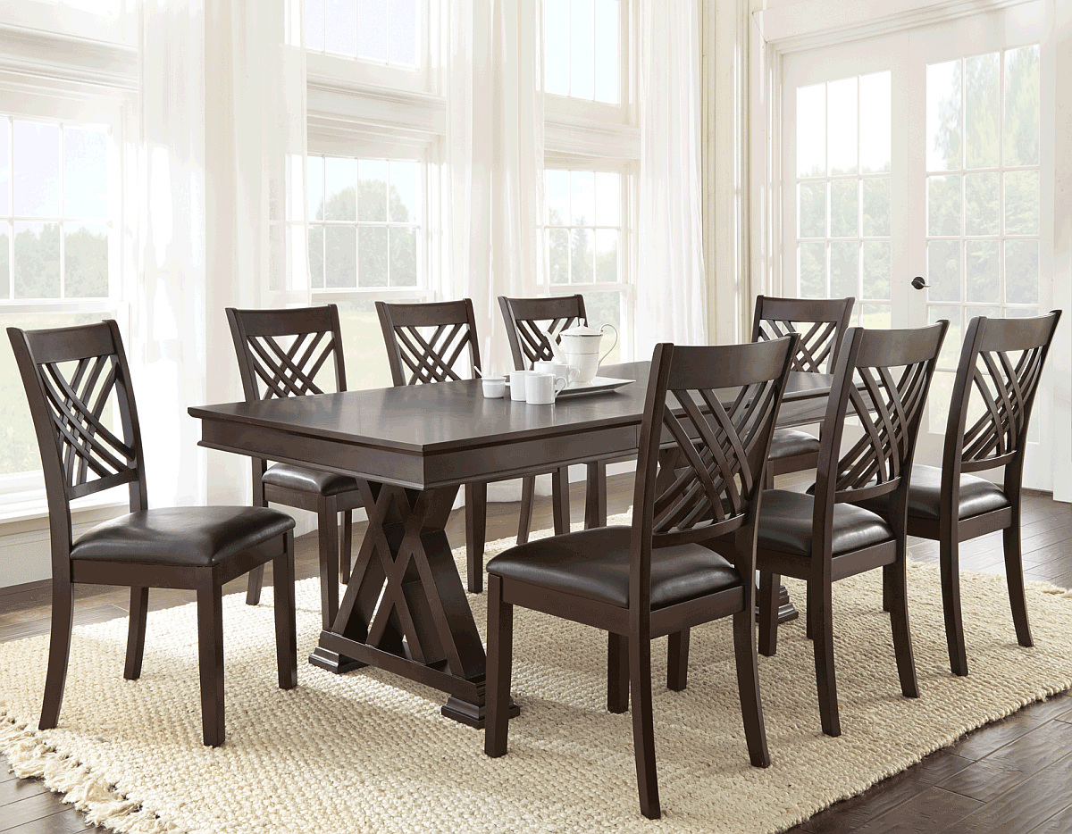 Bold contemporary design in a comfortable dining collection that seats up to eight, that’s Adrian by Steve Silver Company. Stylish “x” back side chairs complement the espresso-finished pedestal table base and add a sophisticated element to your dining experience. Upholstered chairs add comfort and server add storage and serving capabilities to this modern-styled collection.