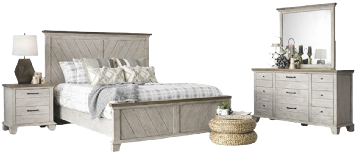 A rustic, farmhouse-inspired bedroom, Bear features a white-smoke finish that contrasts beautifully with honey-smoke stained tops and cap rails. The chevron patterned headboard and footboard is offered in King and Queen sizes and the bedroom collection offers a variety of storage items with ultra-deep drawers supported by side drawer glides for easy operation.Read More