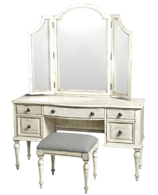 This 3-piece set includes a vanity table, mirror, and stool finished in cathedral white. Built from durable wood, it offers smooth drawers for storage and a comfortable upholstered seat, combining everyday functionality with a clean, timeless look for bedroom or dressing spaces.Read More
