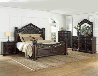 Includes: Queen headboard, queen footboard, queen/king side rails, queen/king headboard posts, king/queen footboard posts, dresser, mirror and nightstand
